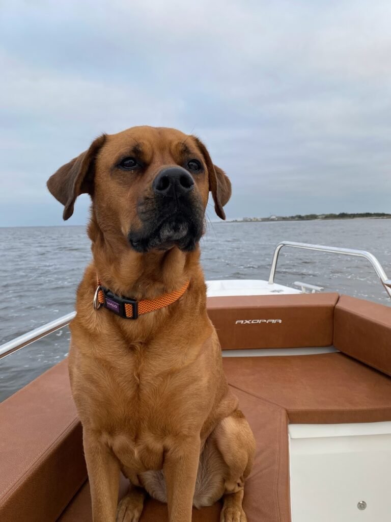 Every boat needs a loyal first mate, and for the Bald Head Water Taxi, that’s Miss Angie — everyone’s favorite four-legged deckhand. Often spotted beside Captain Darren, she keeps watch on the water and greets passengers with her quiet charm and signature tail wag.